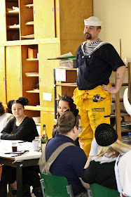 Lyhythihaisena ja lyhyillä punteilla merimiespuku on kuin aikamatka 1900-luvun alkupuolen pikkupoikien kesäasusteeseen. Piirtäessäni hahmomallille tummansinistä merimiespukua, päätin tehdä merimieskauluksen päällisen kiinteänä ja valkoisena koristettuna sinisellä nauhalla. Perinteisesti merimiespuvun irtokaulus on tummansininen kolmella valkoisella raidalla. Suunnittelun kuluessa päätin tehdä myös aluspaidan pukuun. Aluspaita on sini - valko vaakaraidallinen t-paita. Suunnitelmaan kuului myös hahmotelma nilkkaimista ja merimieslakista.